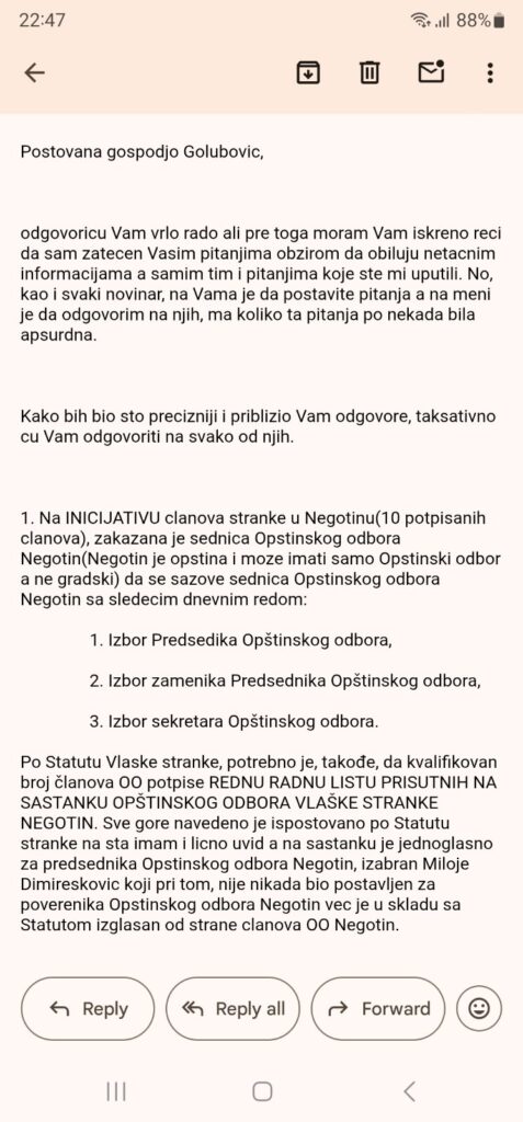 Ovim putem, prenećemo vam u potpunosti pitanja gospodje Golubović, kao i odgovor predsednika Vlaške stranke na njih.