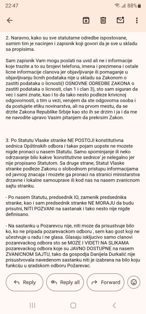 No, kako se to nije dogodilo, već je puštena cela reportaža na pomenutoj televiziji koja obiluje netačnim informacijama a odgovor predsednika Vlaške stranke cenzurisan, čime je dopisnica, kao i televizija na kojoj radi, pokazala ne samo da nije nepristrasna u izveštavanjima koje objavljuju već i da je gledaoce svoje televizije dovela u zabludu.